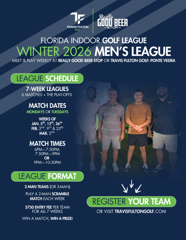 Register your team of 2–3 players for the Winter 2026 Florida Indoor Golf League at Travis Fulton Golf Studio and Really Good Beer Stop, where friendly competition meets cutting-edge indoor golf. Each team will compete weekly on state-of-the-art simulators in a fun, competitive format designed for all skill levels. Enjoy live scoring, league standings, and the chance to win prizes—all backed by the expert guidance of Travis Fulton Golf. Whether you’re sharpening your game or just enjoying time with teammates, this is the perfect way to play and compete indoors. Spots are limited—sign up your team today!